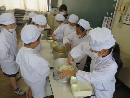 今日の給食は、子どもたちの大好きなカレーライスでした。たくさん種類があるカレーライスですが、今日はチキンカレーライスです。ラッキー人参も!デザートには巨峰もありました。おいしい給食ごちそうさまでした。