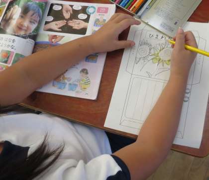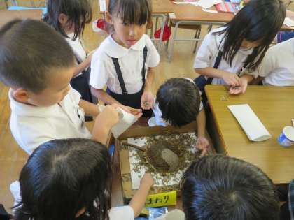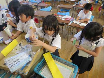 自分たちが育ててきたあさがおとひまわりの種を収穫しました。来年の1年生にプレゼントをするためです。種を入れる袋も手作りです。喜んでくれるよきっと!