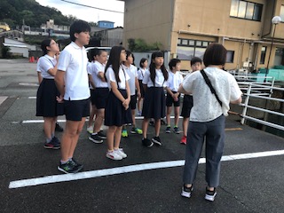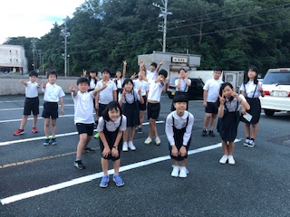 朝の集いをはじめます。係の人の掛け声で「エイエイオー」