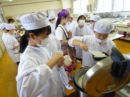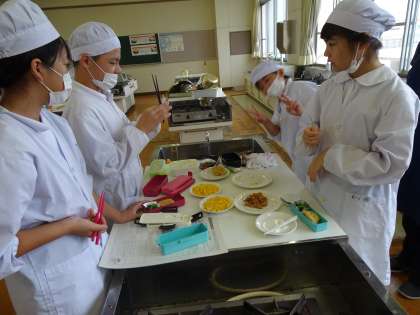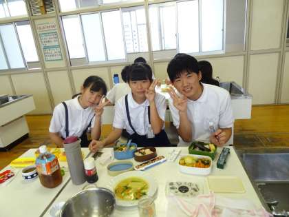 調理実習で、お弁当を作りました。班ごとに献立を考えました。いつも家でやっているのかな?手際がよくて感心しました!見た目はもちろん、味も最高でした\(^o^)/