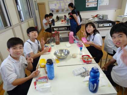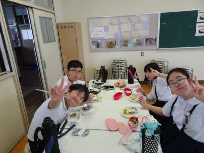 協力して調理をしたグループの友達と記念に写真撮影。いい笑顔ですね!