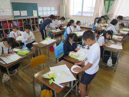お面を作っている4年生。まずは、準備です。紙粘土をしっかり伸ばして柔らかくします。それから、お面の型に薄く広げます。顔のパーツも楽しみ楽しみ!どんなお面に仕上がっていくのかな(*^-^*)