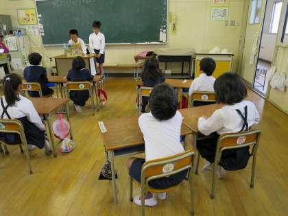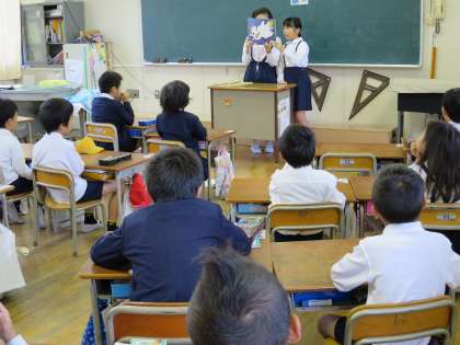 今朝の読書タイムに、図書委員の児童が1・2・3年の教室で紙芝居の読み聞かせを行いました。読み方はもちろん、読んでいる表情も穏やかで優しいお兄さんお姉さんのようでした。