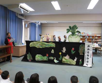 今日は、生野区更生保護女性会「くるみ座」の皆様に指人形劇を見せていただきました。「おおきなかぶら」と「3びきの子ぶた」です。みんなお話の世界に入りこんで夢中になって人形劇を見ていました。最後に、指人形の操作も教えていただきました。皆様ありがとうございました。