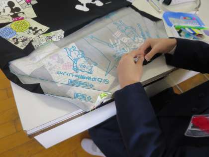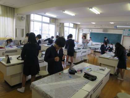 エプロンを作っています。今日は、しつけやアイロンに挑戦です。一針一針真剣そのものです!完成して、みなさんがエプロンを着ている姿を楽しみにしています。