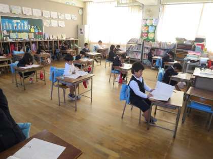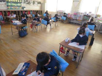 1・2年生は、国語の標準学力調査を行いました。国語では、CDによる聞きとりテストもありました。冊子になった問題を読み返しながらがんばっていました。