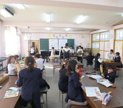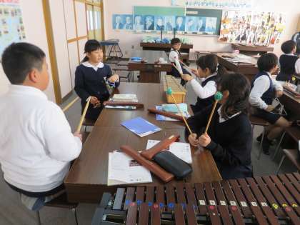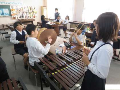 「まほうの音楽」を考えて演奏の練習をしています。楽器の音のひびきの長さや、音色のちがいを生かして音楽づくりをします。アイデアがどんどん出てくるようで、グループで楽しく練習しています。
