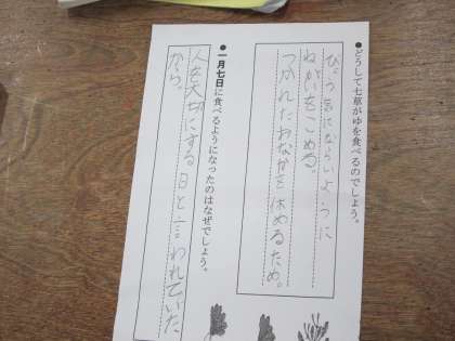 食に関する指導があり、「春の七草」や「七草がゆ」について学習しました。せり・なずな・ごぎょう・はこべら・ほとけのざ・すずな・すずしろ!どうして七草を食べるといいのかな?どうして1月7日に食べるのかな?いろんなことを知り、七草がゆを食べてみたくなったようです。
