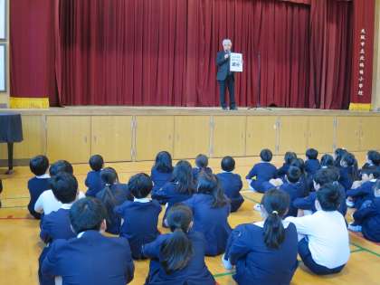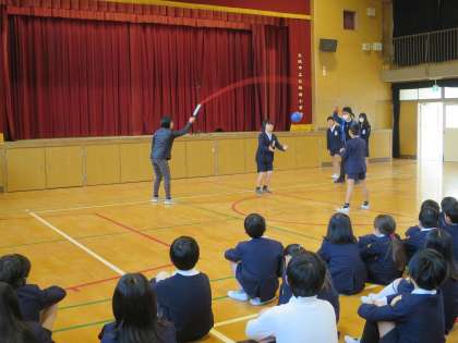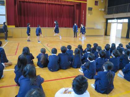 久しぶりの児童朝会です。校長先生からは、節分・立春の話がありました。また、なわとびタイムにおすすめの大なわとびの跳び方の紹介がありました。アレンジを加えた跳び方に拍手の連続でした。