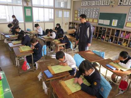 彫刻刀を使って、木版画に取り組んでいます。教室に入ると静かなこと!真剣そのものです。細かい部分も丁寧に丁寧に彫り進めています。