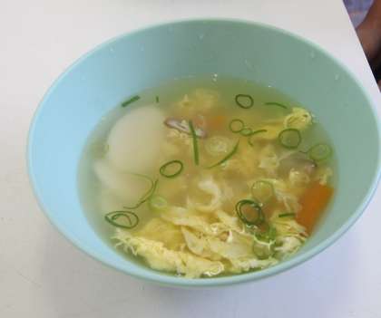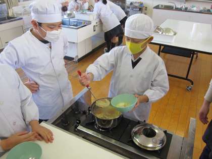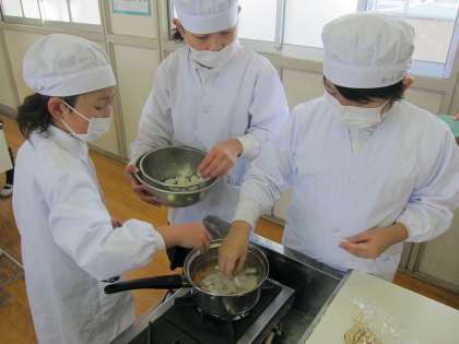 調理実習で、トックスープを作りました。手軽にできる温かいスープです。グループに分かれて楽しく調理しました。みんな「めっちゃおいしい!」と大満足でした。