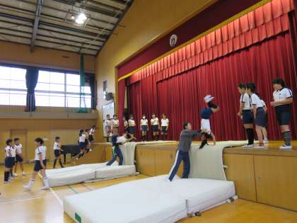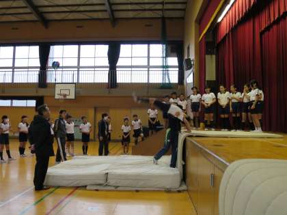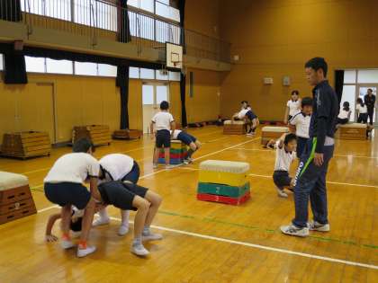 鶴橋中学校の先生をゲストティーチャーにお迎えし、体育の授業をしていただきました。マット運動の頭はね跳びです。最初は、ドキドキしていたようですが、先生にコツを教えていただき練習を重ねると、どんどんできるようになりました!達成感をいっぱい味わえた授業でした。