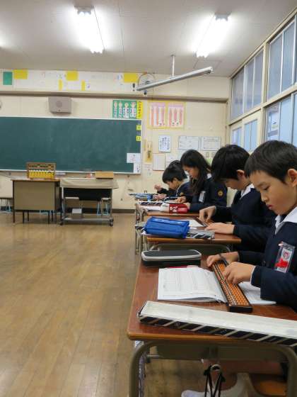 今日はゲストティーチャーをお迎えし、月に1回のそろばん指導が行われました。先月は3つの数をたしたりひいたりしていましたが、今回は5つの数にパワーアップです!1月からは3年生にもそろばん指導を行います。
