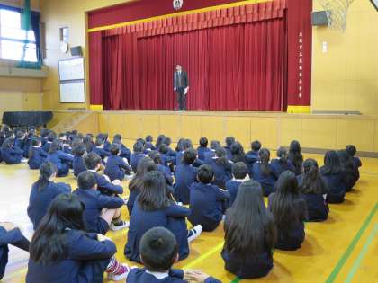 さて、今月の生活目標は「静かに早く 時間を守って 集まろう」です。今朝、講堂に1番早く集合したのは2年生の2人でした。そして時間までにはみんなが講堂に集まれていました。
