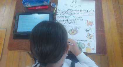 それぞれが一つの国の特産物についてタブレットを活用して調べ、プリントにまとめます