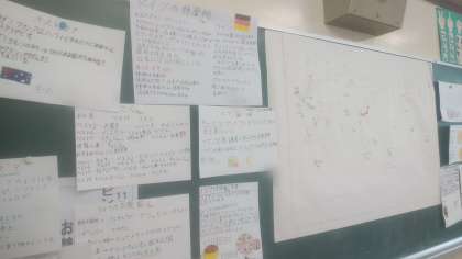 調べた国について黒板に貼ってある世界地図にに書き込みプリントを貼り付けて、みんなのものをまとめて学び合うとちょっとした特産物辞典に!