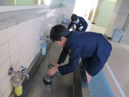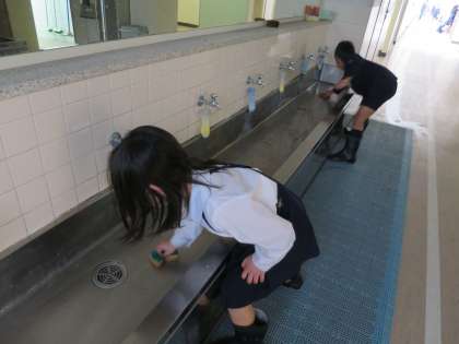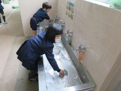 こんな寒い日でも、そうじの時間は手洗い場のそうじも欠かしません。せっけんを使ってスポンジで磨いたり、排水溝を洗ったり。水が冷たくて手は痛いけど、がんばって磨いた後はピカピカでうれしいね!
