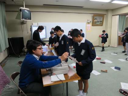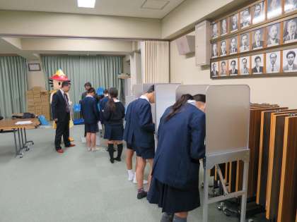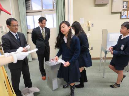 生野区役所選挙管理委員会からゲストティ−チャーをお迎えし、選挙の仕組みや投票の仕方をわかりやすく教えていただきました。投票用紙が破れにくいことを体験したり実際に投票を体験したりしました。