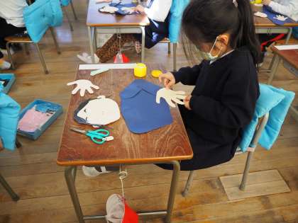 画用紙を切って貼って「あやとりをしている自分」を作っています。