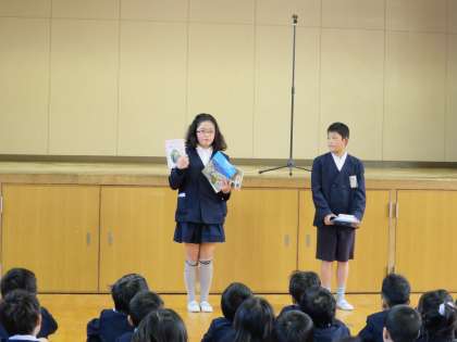 今朝の児童朝会では、先週から行われている百人一首大会にちなんで百人一首のあれこれをたくさん教えていただきました。知らなかったことがいっぱい!うなずきながら興味をもって聞けていましたね。また、図書委員からおすすめの本の紹介がありました。朝会後掲示板の前には早速子どもたちが集まって、おすすめの本を見ていました。早く読んでみたいですね。