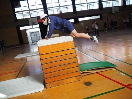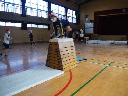今日は「開脚跳び」と「台上前転」の練習をしていました。