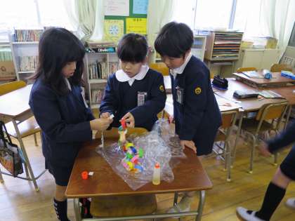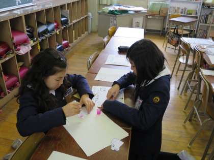今日のたてわり班活動では、卒業をお祝いする会で、6年生にプレゼントする色紙やメダルを作りました。5年生が新リーダーになって下級生のお世話をしながら班全員で感謝の気持ちをこめて取り組みました。