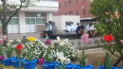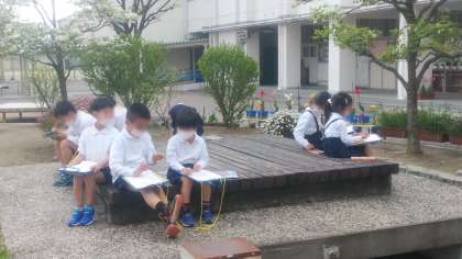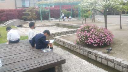2年生が中庭に出てきて「お花見スケッチ」を行いました。