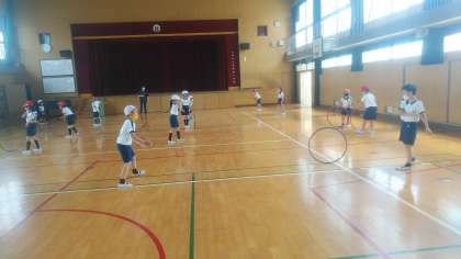 マスクを着用するためあまり激しい運動はできませんが、ソーシャルディスタンスを保ちながらフラフープを使っての運動遊び