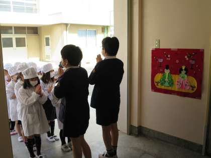 「1年間の給食をふりかえろう」は、3月の給食目標です。給食時のマナーや姿勢、好き嫌いしないで食べられたかなど振り返ってみましょう。さて、今日の給食は、子どもたちの大好きなメニュー「あげどりのねぎだれかけ」が登場しました。給食室のサンプルを見て「やったー!」「おいしそう!」と嬉しそうな子どもたちでした。