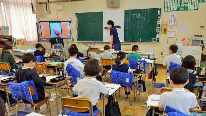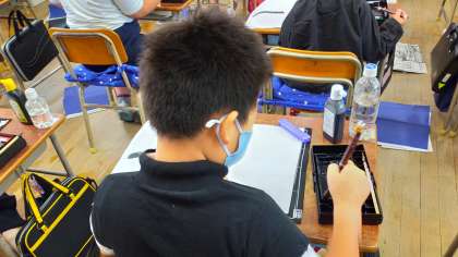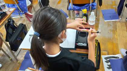 モニタに映し出された画面を見ながら筆づかいを学びました。