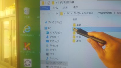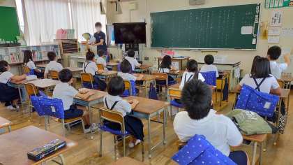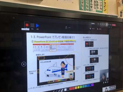 北鶴橋小学校では電子黒板ユニットを装着した大型モニタがすべての教室に設置されています。また、各クラスの大型モニタにはTeamsやデジタル教科書の入った授業用パソコンが常設されています。
