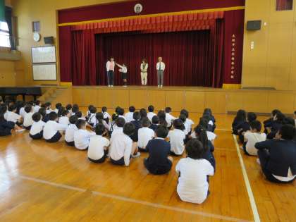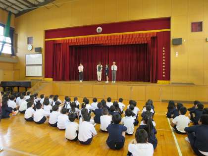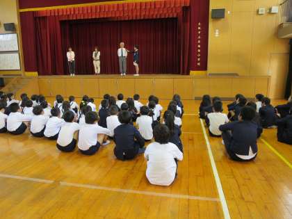 今朝の児童集会では、集会委員の児童が4月に転勤してこられた先生方にインタビューをしました。先生方はどんな答えを返してくれるかな?みんな興味津々でインタビューを聞きました。