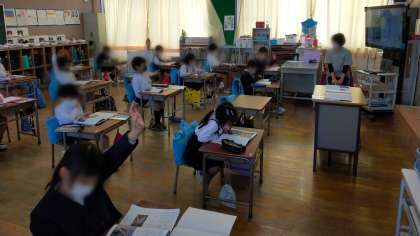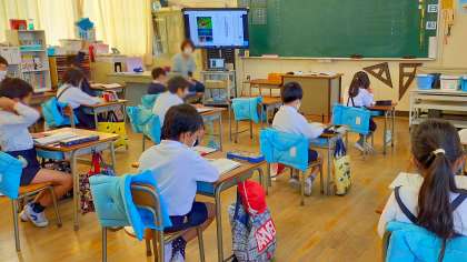 大型モニタに映し出されたデジタル教科書と手元にある教科書とを見比べながら、文章の場所についてCheck!