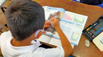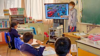 黒板横の大型モニタに映し出されたデジタル教科書と見比べながら、教科書に記載された読み取る資料の確認。
