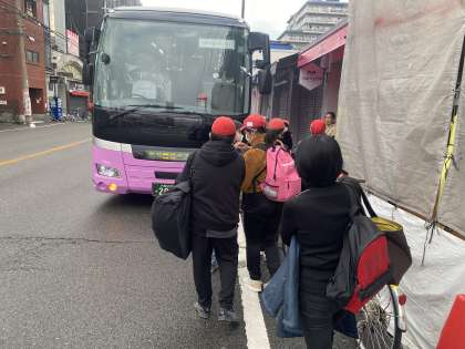 今から貸切バスで海洋センターに向かいます。