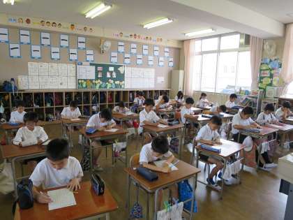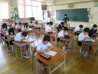 プリントの短文を読んで、問題に答えます。問題が配られると、早速集中して真剣に取り組んでいました。