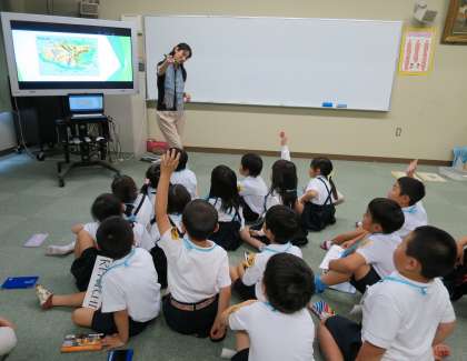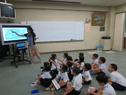 1年生は、C−netの先生と英語の学習をしました。先生の出身地ハワイの写真をたくさん見せていただきました。説明も全部英語・・・。でも聞き取れる単語もあり、意味がわかるとうれしそうでした。英語での自己紹介ゲームも楽しみました。
