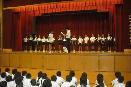 始業式は8時45分から始まりますが、どの学年も少し早めに講堂に集まり、体育座りで待っていました。雨の音だけが響いていました。すばらしい態度です!落ち着いたいいスタートがきれました。