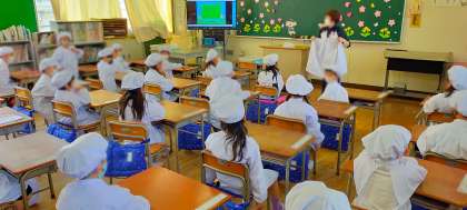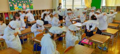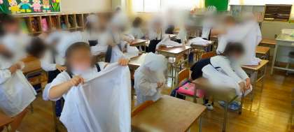 今日は給食エプロンの着方やたたみ方について学習しました。
