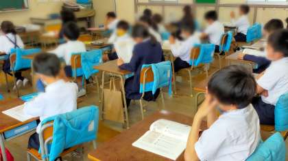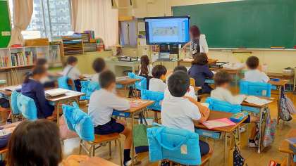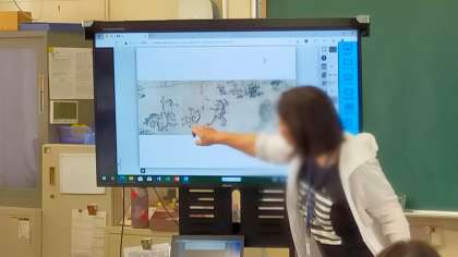 大型モニタに映し出された絵を使って、鳥獣戯画の感想を言い合いました。