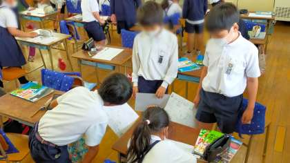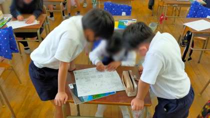 みんなで協力し合いながらプリントで指定された国の名前を探しました