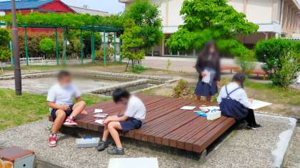ぽかぽか陽気の中、5年生が中庭で絵画に勤しんでいました。