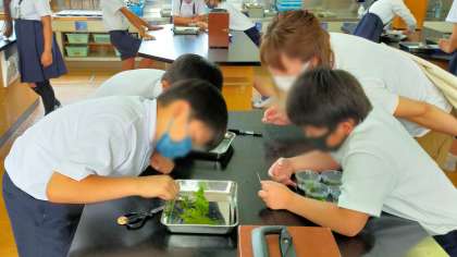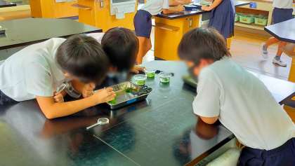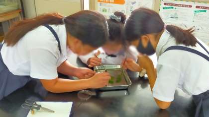 ピンセットと虫めがねを使って水草に付けられたメダカの卵を探しました