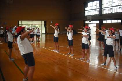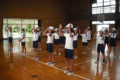 今日から応援団の練習も始まりました。3年から6年までの代表児童33名が赤白に分かれて練習しています。