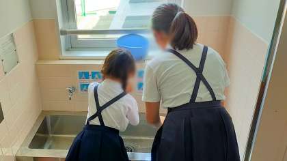1年生と6年生がいっしょにそうじをしている場面に出会いました