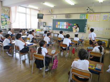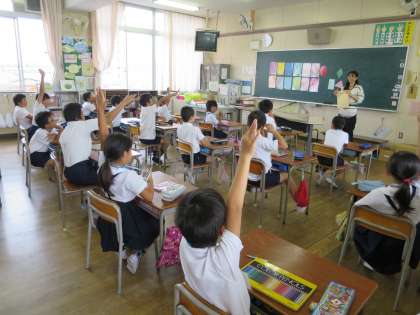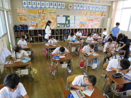 C−netの先生と、色や形について英語で楽しく学習しました。色や形の発音を覚えてビンゴゲームもしました。