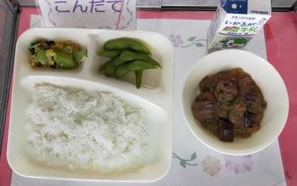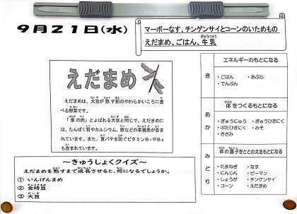 給食の放送を聞いて、「枝豆」を熟すまで成長させると「大豆」になると聞いて、驚く子もちらほらと…