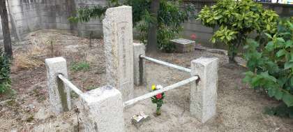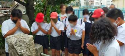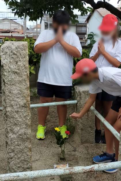 9月21日は「室戸台風慰霊の日」、6年生児童が慰霊碑にお花とお菓子を供え、手を合わせながら慰霊を行いました
