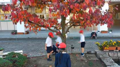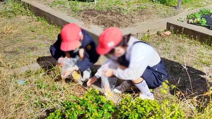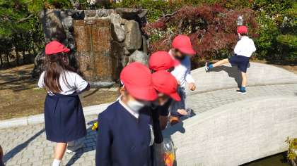 のぞいてみると子どもたちはビニル袋を持って紅葉した落ち葉などを集めていました