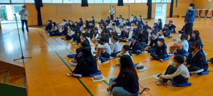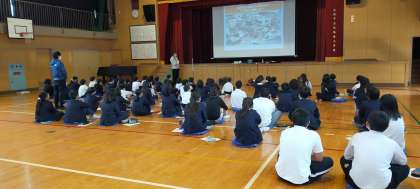 4年生以上が講堂に集まってゲストティーチャーから防災について教わりました